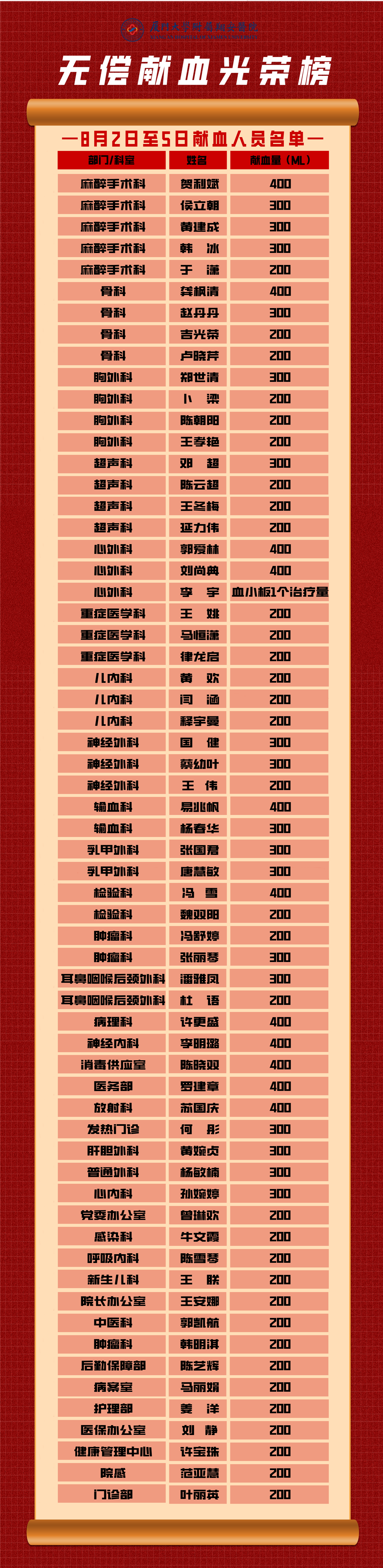 为应对暑期临床用血紧张的状况,8月2日至5日,院工会、输血科共同组织开展无偿献血活动,共有36个部门科室、62名干部职工积极参与,献血总量达16000毫升。