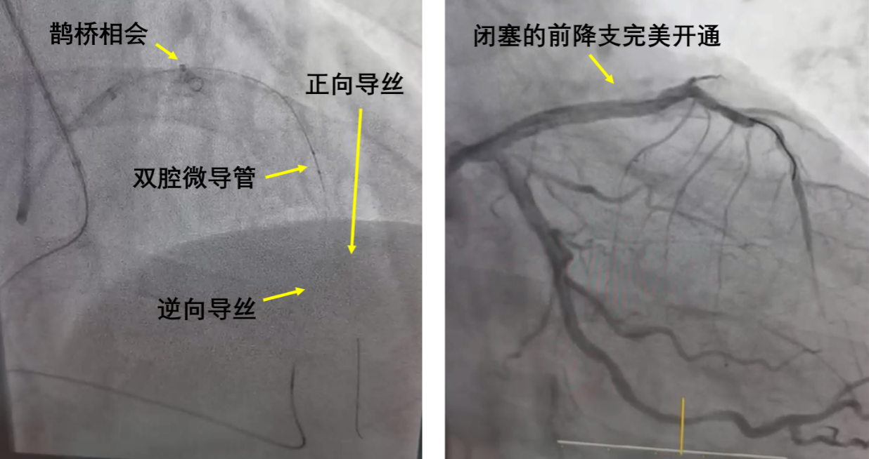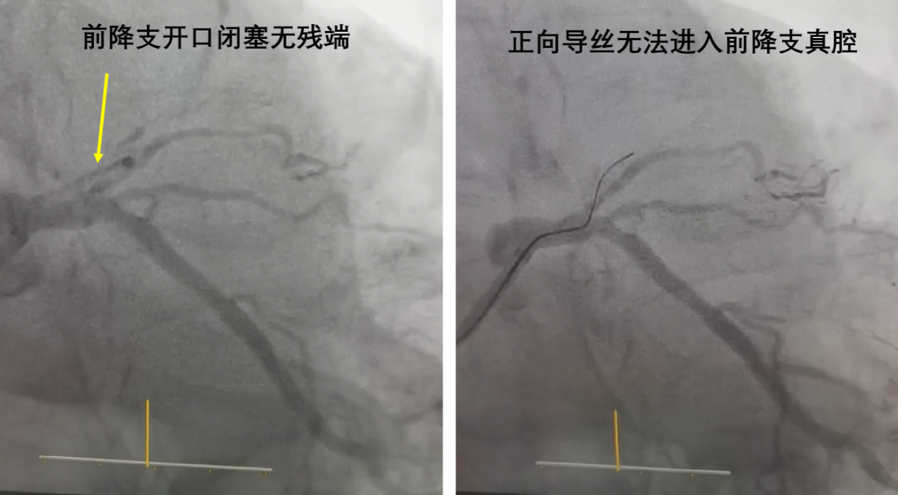 手术当天,刘炳辰教授团队首先采取传统的正向手术方案,用不同硬度的导丝尝试通过前降支闭塞段,但由于老张的前降支闭塞处无残端,闭塞段内存在严重钙化,正向手术无法找到前降支真腔。此前老张多次尝试开通未果,也正是因为这个原因。