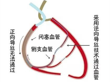 2.逆向导丝技术 CTO病变约占需要血运重建治疗冠脉病变的30%。由于血管腔完全堵塞,常规正向操作导引钢丝操作技术难以顺利通过病变,此时逆向导丝技术反而能打通 “任督二脉”,极大提高手术成功率。逆向导丝技术,简单地说就是在一支冠状动脉闭塞后,从另一支向它发出侧枝循环的冠状动脉送入导丝,沿侧枝循环送入闭塞血管,从闭塞病变的远端逆向开通CTO病变。相对于正向导丝技术,逆向导丝技术难度更大、风险更高,是冠脉介入最大的挑战,要求手术医生熟练掌握冠脉介入治疗的各种技术操作,并有足够的能力预见并减少各种并发症的发生。即使在全世界最先进的冠脉介入中心,也没法保证保证每位患者能顺利开通血管,因此,应用逆向导丝技术处理CTO病变,也被形容为“悬崖上的舞蹈”。