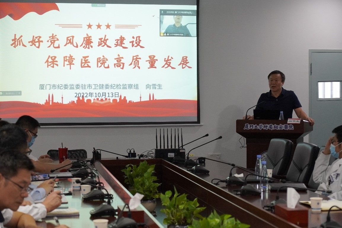10月13日,厦门大学附属翔安医院党委理论学习中心组组织专题学习,特邀厦门市纪委监委驻市卫健委纪检监察组副组长向雪生来院授课,以“抓好党风廉政建设,保障医院高质量发展”为主题作讲座。院党委副书记、纪委书记傅万里主持会议,院党政领导班子、各科室职能部门负责人、护士长、各支部书记参加,思明院区通过线上参与学习。