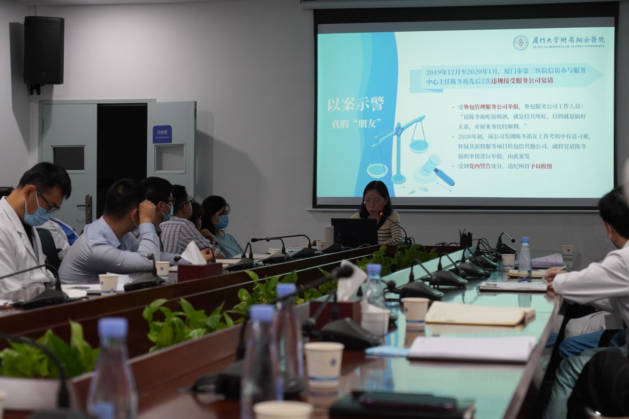 纪检监察室工作人员章哲首先带领大家作专题学习。章哲着重介绍了《九项准则》的第八、九两条内容,解读了厦门市卫健委和厦门大学附属翔安医院关于收受“红包”“回扣”责任追究的相关规定,并且结合真实案例讲解了收受“红包”“回扣”将会受到怎样严重的处理。学习会重点强调了容易被忽视的“饭桌违纪”问题,指出接受管理服务对象组织或者支付费用的宴请是明令禁止的一种收受“回扣”行为,要求医务人员恪守交往底线,严禁参加药品、医疗设备、医疗器械、医用卫生材料等医疗产品生产、经营企业或者经销人员安排、组织或者支付费用的宴请或者旅游、健身、娱乐等活动安排。