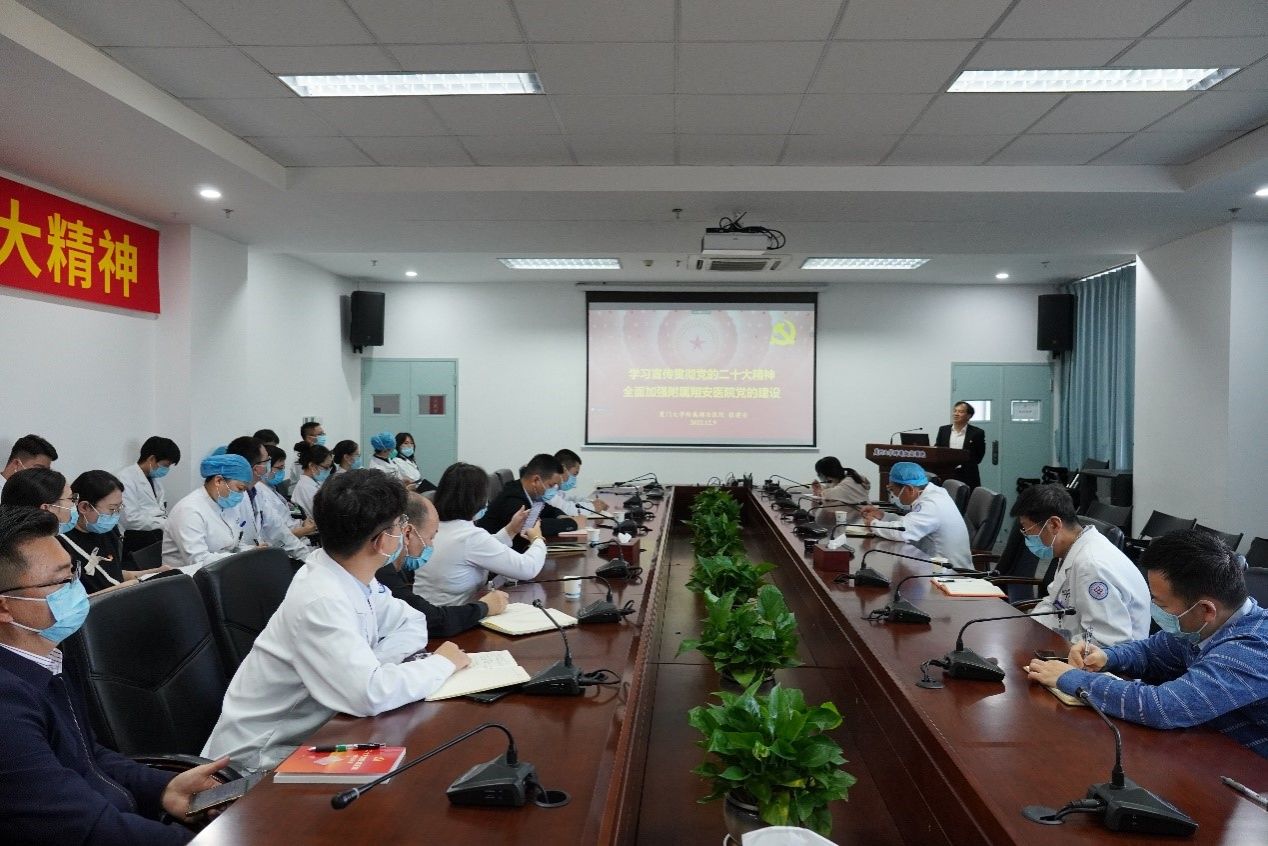 张建安书记从全面准确学习领会党的二十大精神、推进新时代党的建设新的伟大工程、坚持以一流党建引领医院高质量发展和充分发挥党支部的战斗堡垒作用四个方面,阐述如何“学习宣传贯彻党的二十大精神、全面加强附属翔安医院党的建设”。张建安书记强调,党支部书记和委员要不断提高政治站位和能力素质,宣传贯彻落实好党的二十大精神;要加强党支部班子建设,增强党支部的战斗堡垒作用和党员的先锋模范作用;要发挥党支部“七个有力”,实现党建与业务融合发展,为医院高质量发展提供组织保证。