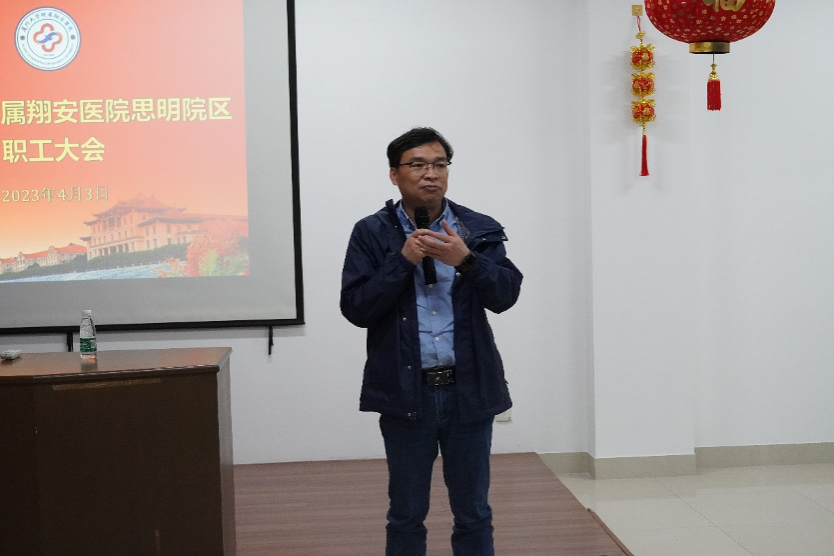 4月3日下午,我院思明院区召开职工大会,宣布在两院区融合过渡时期成立思明院区管理委员会,由医务部副主任刘宗泓等6人负责院区工作的运行开展。党委书记左正宏、执行院长何伟玲、副书记傅万里、管理委员会成员及思明院区全体职工参加会议,会议由傅万里主持。
