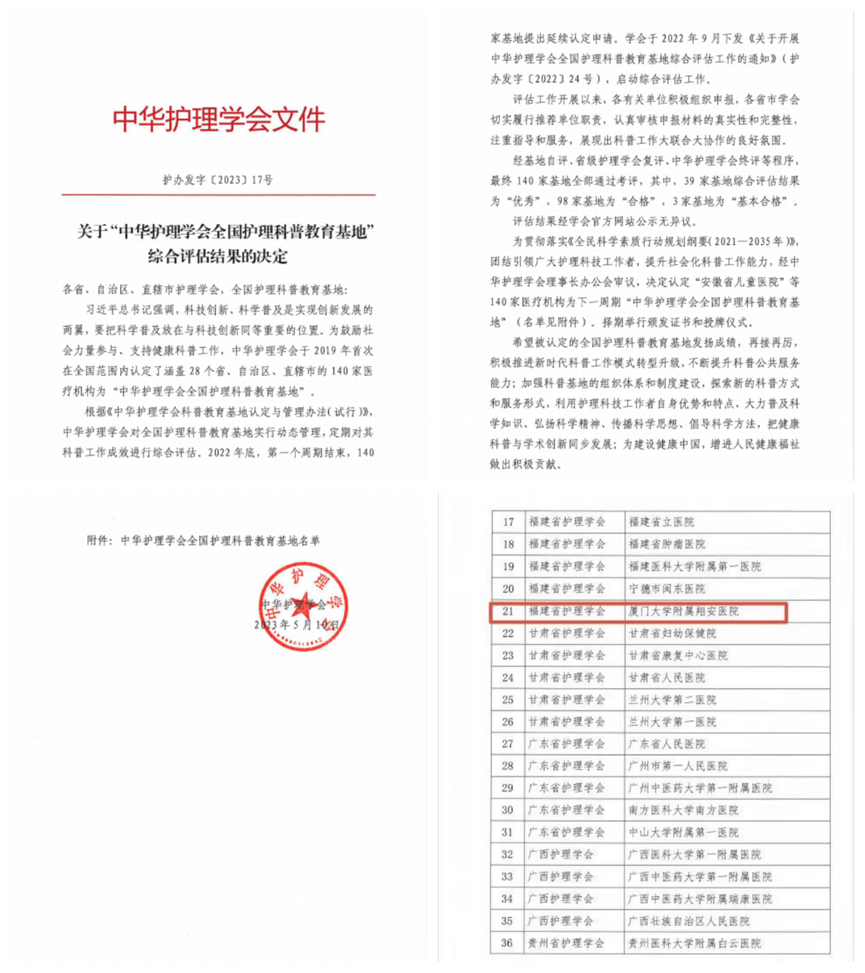 喜讯!厦门大学附属翔安医院顺利通过中华护理学会全国护理科普教育基地综合评定