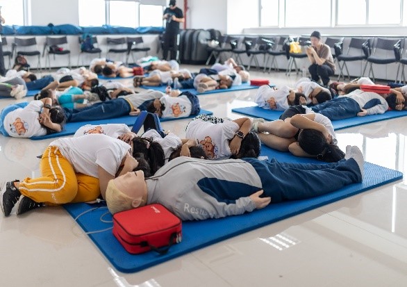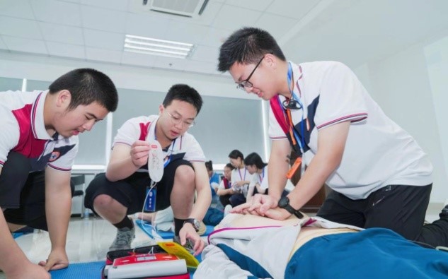 在急救技能培训环节,急诊医学科张贵、何涛针对不同年龄段定制了授课内容:针对小学生群体,聚焦常见的家庭与校园意外伤害,讲解踩踏事件的预防和应对措施,如何拨打急救电话等内容;针对高中生群体,讲授CPR+AED的使用,并设定模拟场景进行教学与实操。两位老师通过生动讲解、现场演示、提问互动,实操演练,纠错辅导,让孩子们初步掌握了实用的急救技能。