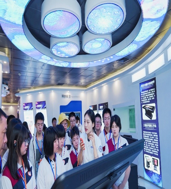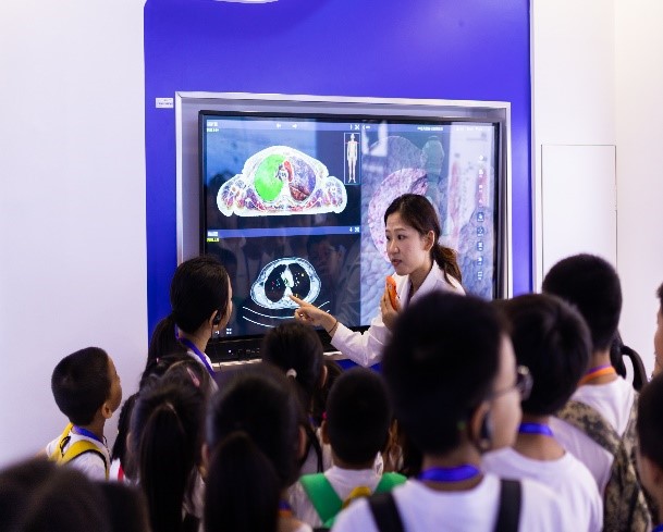 在人体生命科学馆里,付歆欣老师和靳福真老师讲解了人体器官系统的科普知识,展示了虚拟现实(VR)、增强现实(AR)、3D打印及重建等高端的医学模拟技术,让学生们“沉浸式”感受医学的伟大、人体的神奇和科技改变时代的力量。
