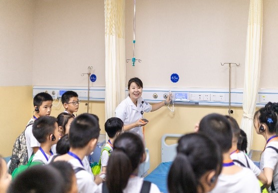 破冰环节结束后,学生们根据年段分两组轮换,进行医院参观体验、生命教育和急救科普等活动。国家临床教学培训示范中心副主任张莉莉带领60名小学生到医院门诊、健康管理中心、急诊医学科和停机坪等处参观。