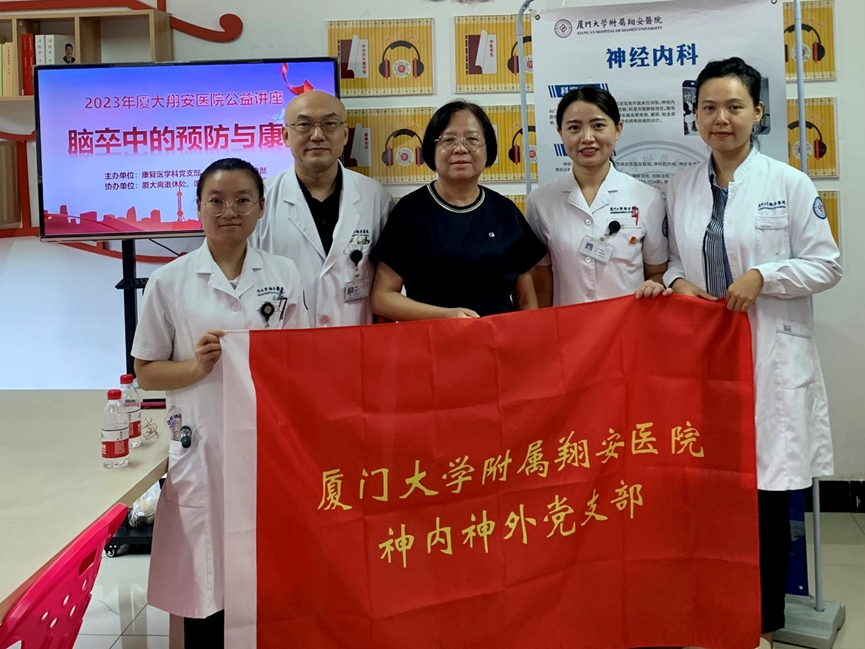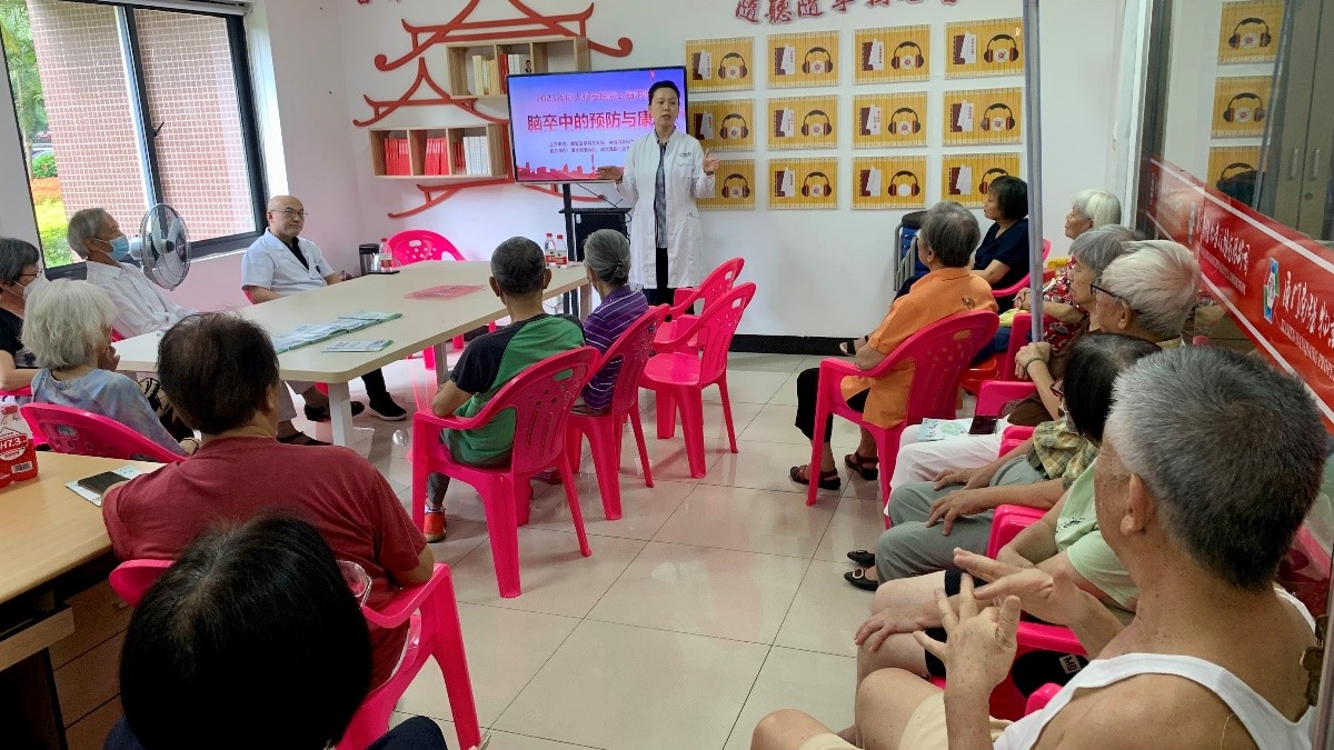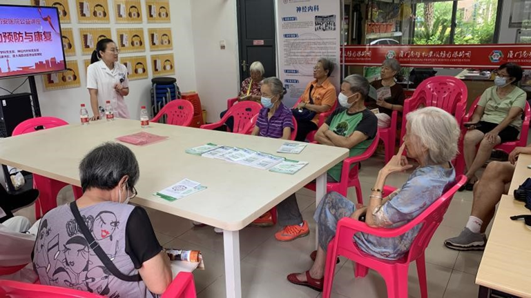 为宣传普及脑卒中健康知识,增强民众预防意识,帮助脑卒中患者获得更好的康复治疗,8月27日上午,我院康复医学科、神经内科和神经外科在厦门大学海韵北区联合举办了脑卒中主题公益讲座及健康咨询活动,活动吸引了30余位厦门大学离退休教职工以及周边居民参加。院党委副书记傅万里到场指导工作。