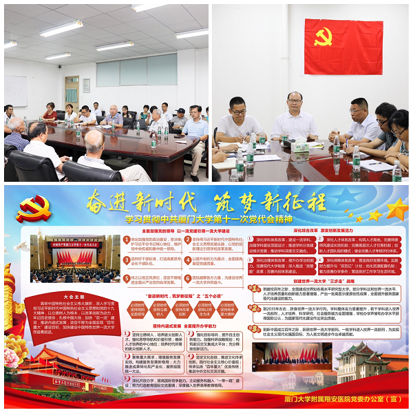 加强领导,把学习融入到推进党建工作中去。我院党政班子非常重视政治建设、思想建设,要求把开展学习贯彻党的十九大精神、习近平新时代中国特色社会主义思想的理论学习融入日常,把学习宣传贯彻中共厦门大学第十一次党代会精神作为重要工作来抓。我院结合工作实际,拟定学习计划,制作宣传展板,编辑应知应会内容,在党员干部和群众中树立“德才兼备、以德为先”的氛围,深入贯彻习近平总书记在首个“中国医师节”的重要指示,培育敬佑生命、救死扶伤、甘于奉献、大爱无疆的崇高职业精神,为健康中国、健康厦门、服务师生、服务百姓做贡献。