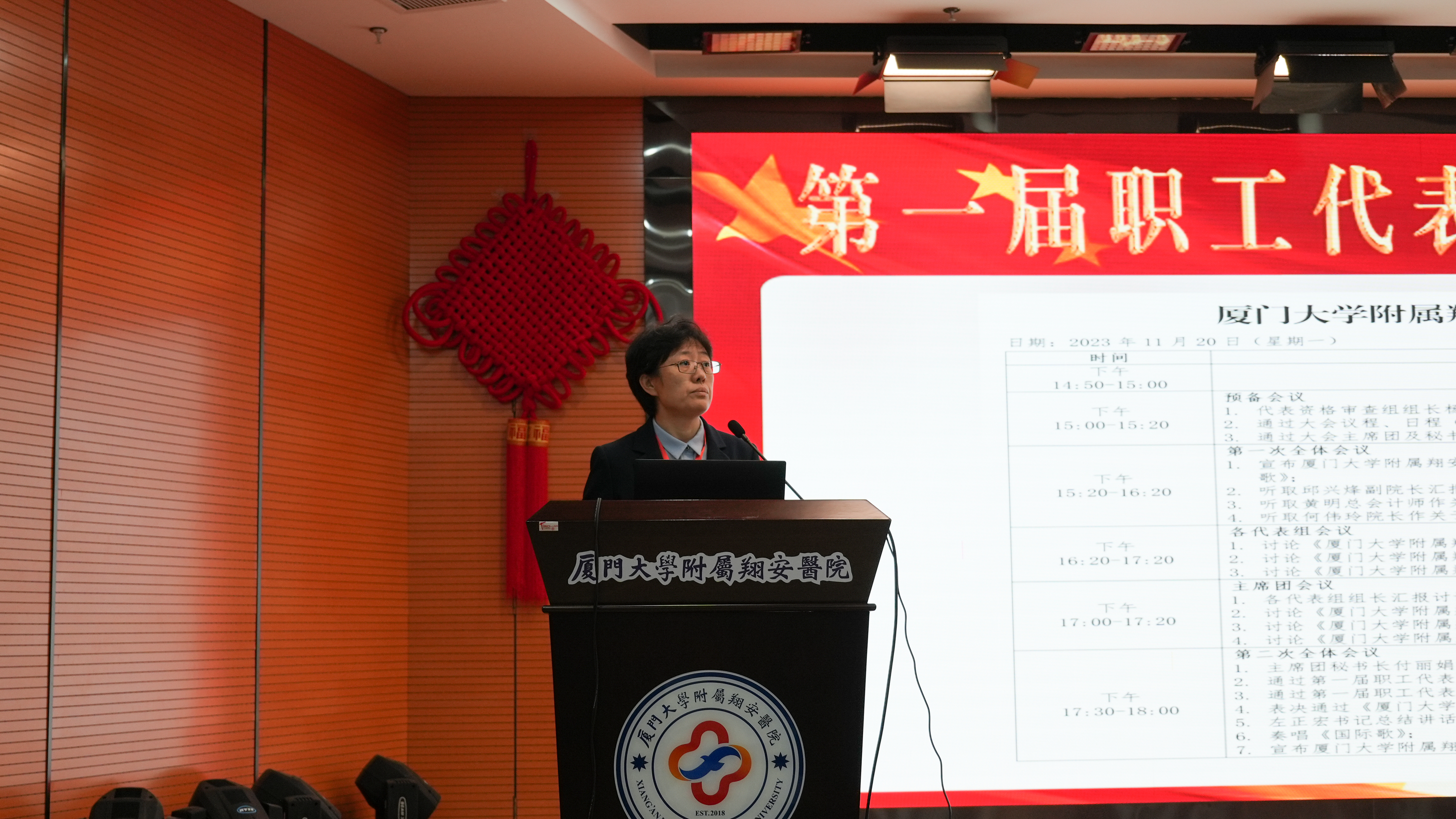 工会主席付丽娟主持厦门大学附属翔安医院第一届职工代表大会第五次会议预备会议。