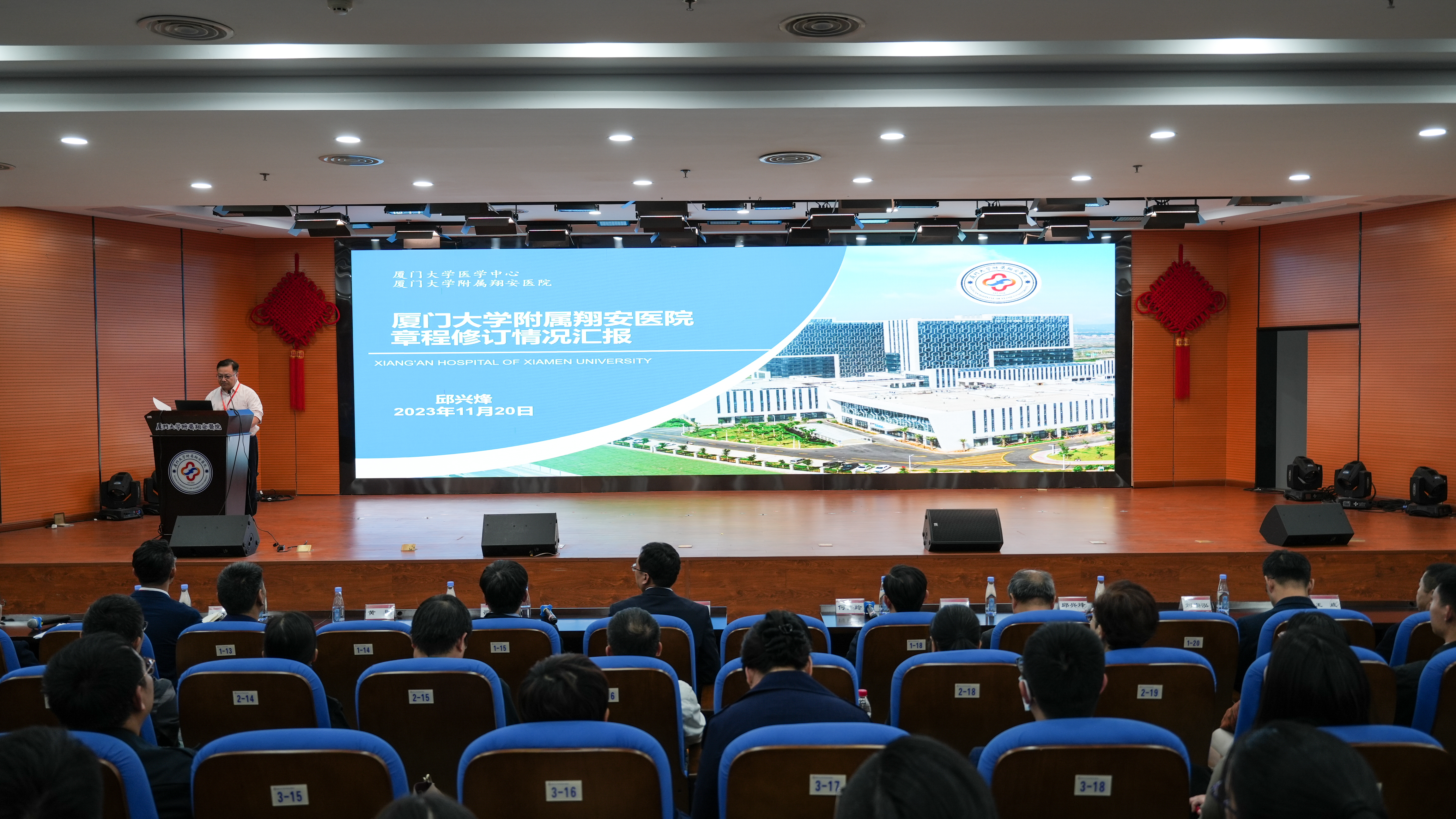 副院长邱兴烽汇报《厦门大学附属翔安医院章程》修订情况,分别从章程修订背景、修订过程、修正案(草案)具体修订内容三个方面进行介绍。