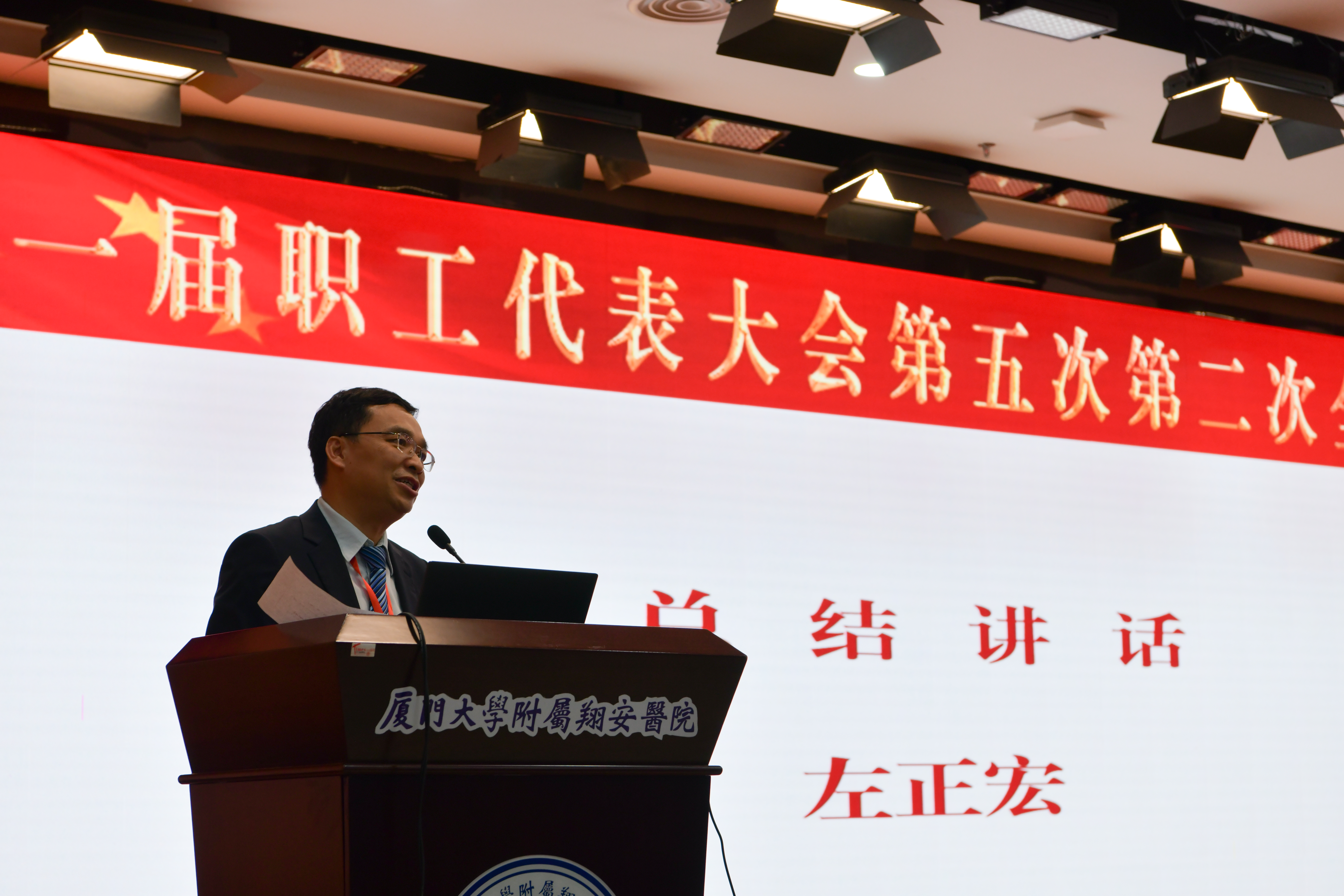 院党委书记左正宏在总结发言中指出,代表们认真履行职能,积极建言献策,共商医院发展大计,充分体现了大家的主人翁精神。本次会议明确了我院未来的工作重点,也确立了全院职工的奋斗目标和努力方向,我们要牢记医者的初心使命、扎实工作,以创建“三甲”为抓手,持续推进医院高质量发展,力求做到制度立院、人才兴院、文化塑院,实现医院和职工共同成长、共同进步。
