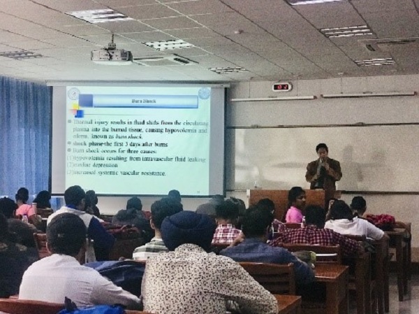 贾赤宇教授承担2018年本科临床医学英语课程班(MBBS)的《Burns and Wound Care》(烧伤和伤口愈合)授课任务。MBBS共有留学生61名,主要来自印度、韩国、卢旺达等国家。课堂上,贾教授根据自己多年的科研和教学经验,结合《Burns and Wound Care》课程内容,为学生讲授了烧伤和伤口愈合的基本知识和临床技能操作。