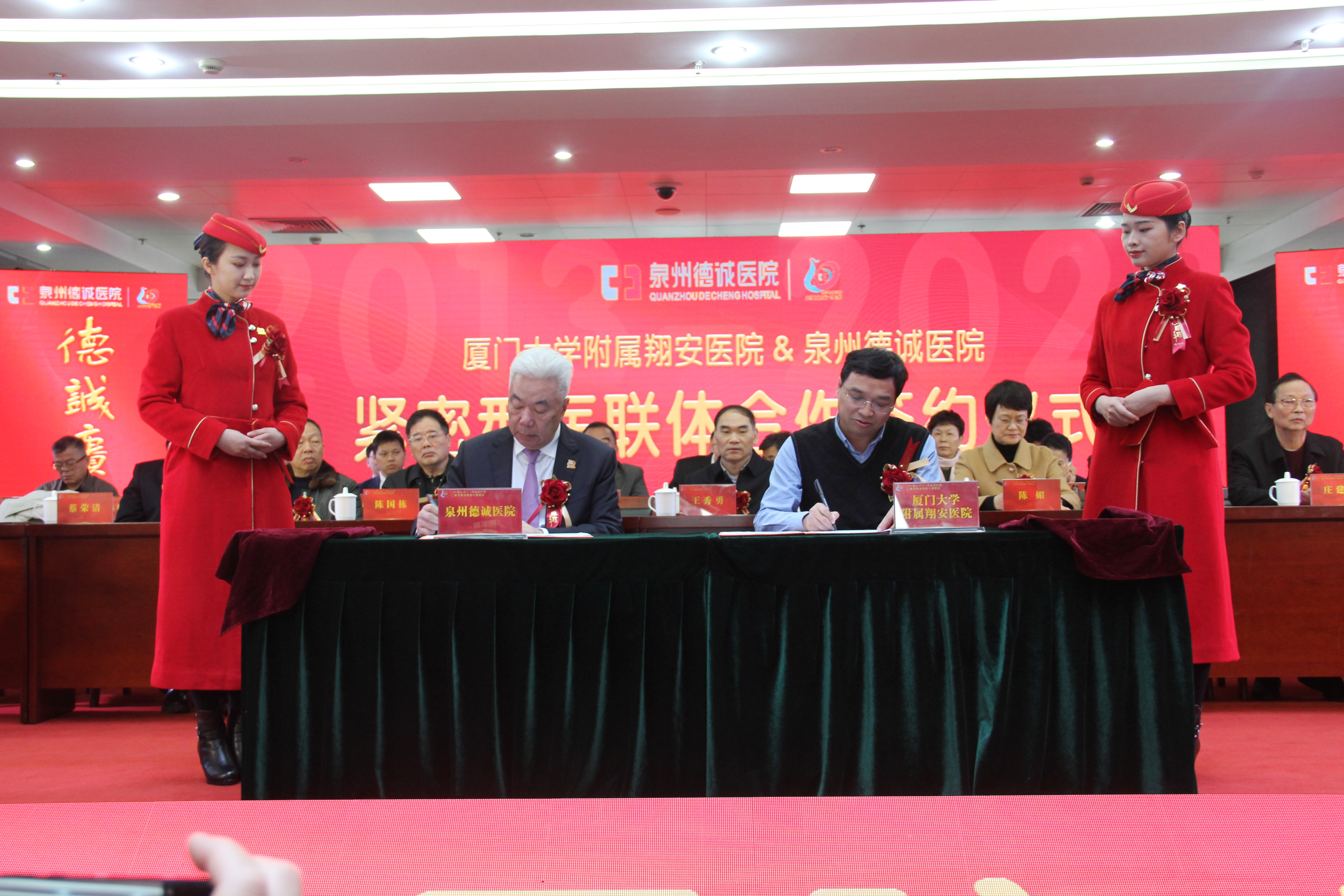 12月28日,我院与泉州市惠安县德诚医院签约医疗健康联合体,泉州市惠安县德诚医院董事长张其聪、我院党委书记左正宏代表医院签订合作共建协议,惠安县三级调研员陈国栋、惠安县人民政府副县长陈剑虹、华侨大学副校长王秀勇、福建医科大学党委统战部部长陈媚、泉州市医保局调研员杨其祥等领导出席签约仪式。