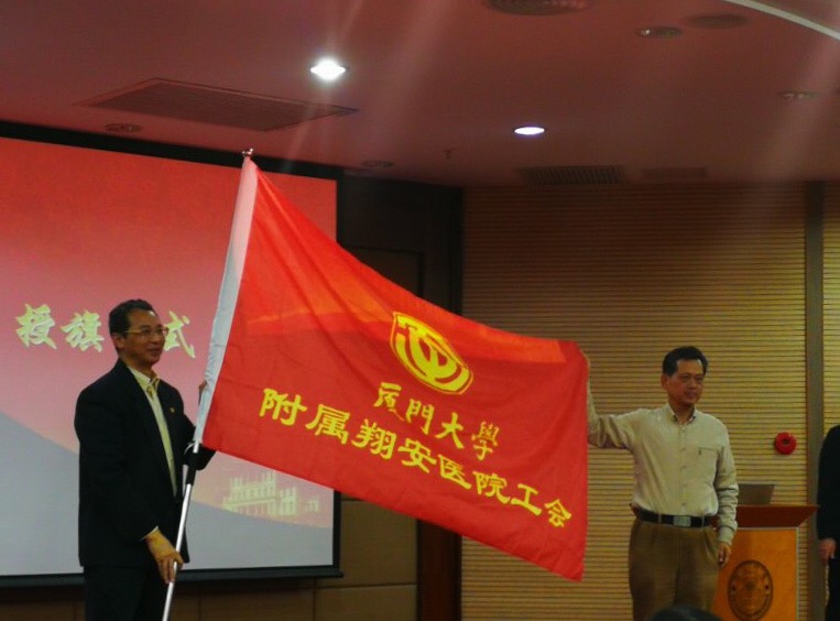 校党委副书记、纪委书记、工会主席赖虹凯授予厦门大学附属翔安医院工会会旗