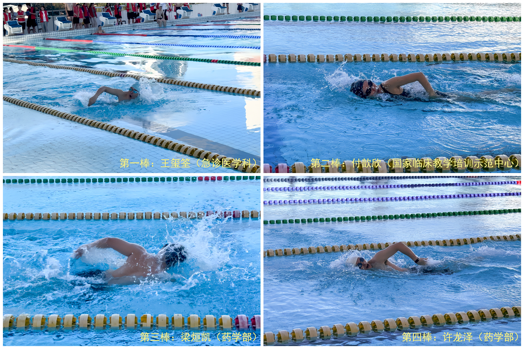 我院药学部许龙泽、梁烜凯,急诊医学科王玺筌及国家临床教学培训示范中心付歆欣代表医院参加男女教工组4×50米自由泳接力赛,队员们凭借出色的团队协作和游泳技巧从9组队伍中脱颖而出,成功跻身前三。