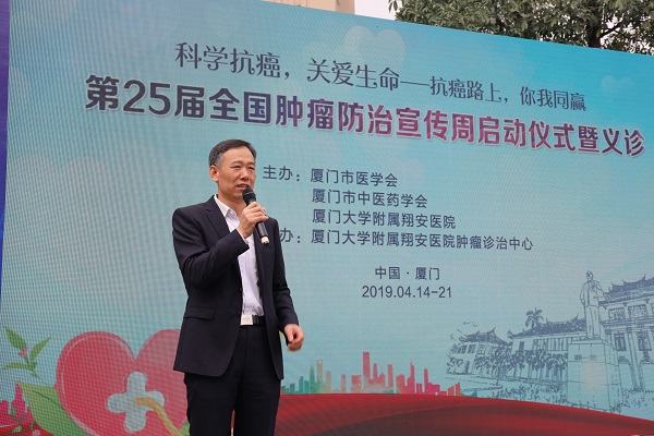 厦门市卫健委医政医管处陈洪涛处长在致辞中代表厦门市卫健委对参加肿瘤防治宣传周的专家教授和医护人员表示热烈的欢迎,对厦大附属翔安医院的盛大开业表示祝贺,也向长期以来支持厦门市卫生和健康事业发展的各界朋友们表示诚挚的谢意。他指出此次活动是由厦门市医学会、厦门市中医药学会及厦大附属翔安医院共同举办,旨在宣传健康的生活方式,医疗机构采取有效的癌症防控措施,做到早发现、早诊断、早治疗,提高生存率,为“健康中国”贡献力量,为美好明天做出行动。