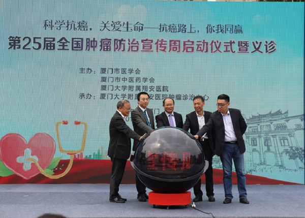 水晶触摸球启动将仪式带向了高潮,伴随着主持人倒数“5,4,3,2,1”,领导与嘉宾共同启动水晶球,“第25届全国肿瘤防治宣传周正式启动”的文字缓缓出现,全场领导嘉宾与医务工作者共同见证了厦大附属翔安医院举办的第一个肿瘤防治宣传周启动仪式。