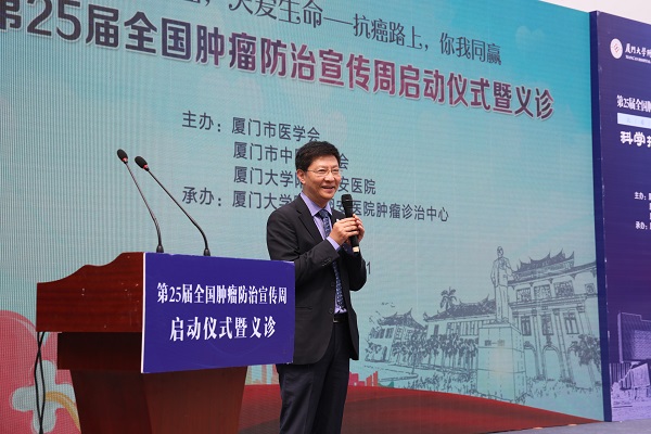 厦大附属翔安医院执行院长张国君教授在致辞中代表翔安医院向莅临活动现场的各位来宾表示热烈欢迎。他指出恶性肿瘤发病率、死亡率呈上升趋势。关于癌症,很多人认为是不治之症。但是,人们的解读是有误区的,癌症是可防、可治、可控的。肿瘤诊治中心是医院发展的重点临床诊治中心,医院将发挥多学科协作的优势和特长,厦大附属翔安医院把肿瘤防控工作做得更扎实、更深入,造福百姓。