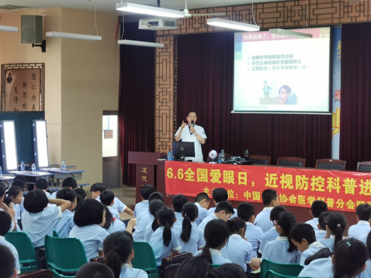 活动伊始,厦门大学医学院副院长李炜教授为同学们讲解了眼部保健及近视防控知识。李炜教授用通俗易懂的语言,生动有趣地为同学们讲述了眼睛的结构、近视的发病原因、预防近视以及延缓近视加重的方法等科学知识。还与现场的小学生们进行了互动,同学们热情高涨、踊跃答题,李教授对同学们的回答一一耐心点评,同时,也提倡老师及家长们起到积极关注、科学引导的作用。