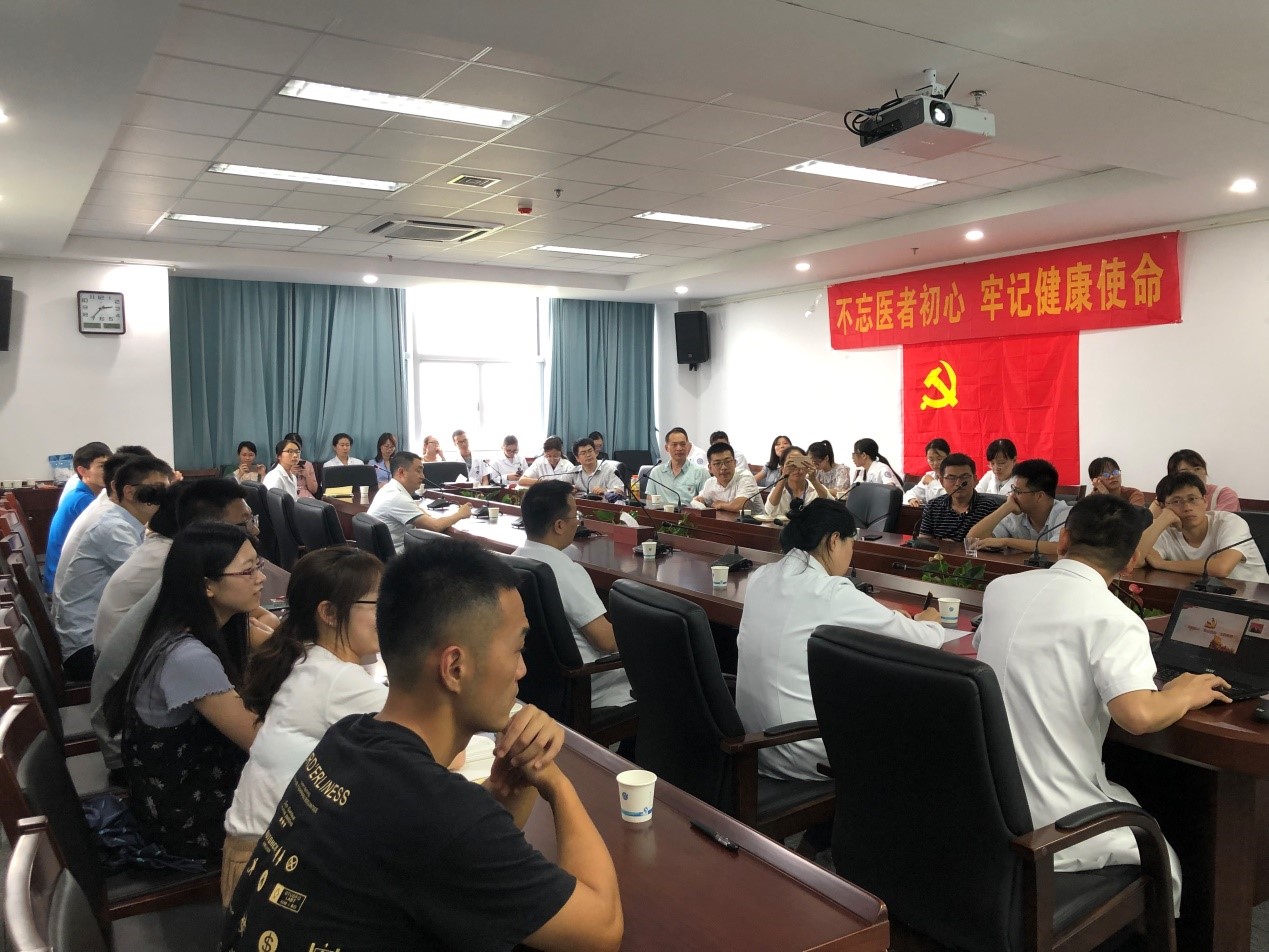 在医师第一党支部书记王威同志的带领下,参会人员共同学习了习近平总书记“不忘初心、砥砺前行”的重要讲话。王威提出,希望支部全体党员坚持全心全意为人民服务的初心,弘扬救死扶伤的人道主义使命,不断为增进人民健康做出新贡献。双方还就各自的特色工作开展情况进行了交流讨论,对支部结对共建提出了设想和建议。