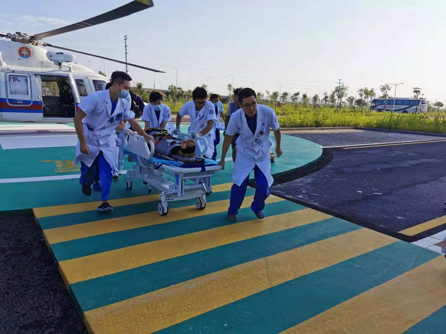 救援直升机一落地,急诊科救援团队立即上前,救援工作无缝衔接、流畅快速。因抢救及时,患者目前病情稳定,经初步诊断,患者为胸部外伤并多发肋骨骨折,已被送至相关科室进行进一步治疗。