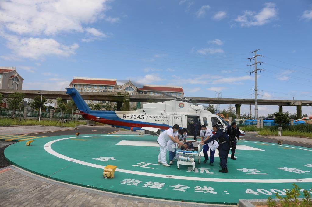 危难时机显身手。当接到海上救援请求信息后,东海第二救助飞行队立即制定救援计划、申报航线,并在救援转运过程中实时监测病人生命体征,将前线病人最新情况通报翔安医院,展开海陆空联合救援救治。同时,翔安医院立刻启动救援应急预案,根据病人数量及病情组成相应医疗专家组,将病人从救援直升机转运回急诊科,立即进行查体问诊,建立静脉通路,监测生命体征,组织临床科室专家会诊,完成相关检查、检验,同时根据检查结果进行手术抢救,并视情转入专科治疗。