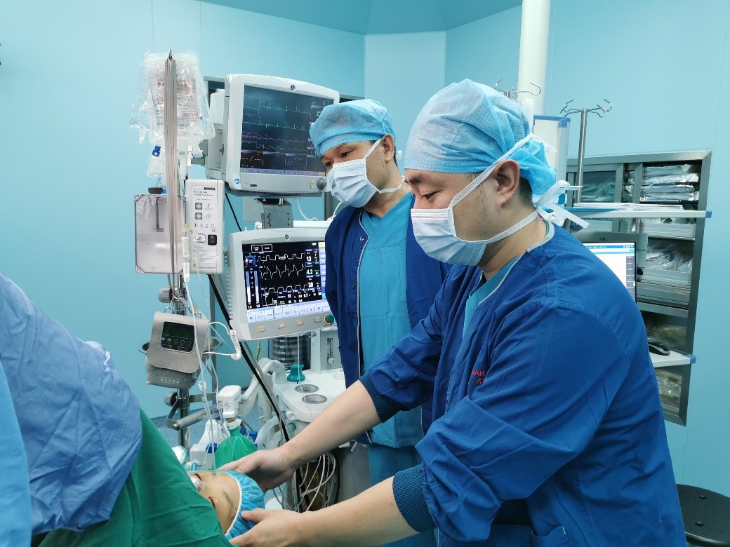 经充分准备后于9月12日上午,在全身麻醉下行腹膜后肿瘤探查术及切除术。开腹后发现瘤体较大、位置较深、操作空间有限,与许多脏器粘连致密,血供丰富,手术难度非常大。在肝胆外科李文岗主任、陈福真教授、夏晓刚主治医师等密切配合下,迅速沿大血管剥离瘤体,迅速止血,用时不到2个小时就顺利完成手术,而且术中出血很少。手术前,麻醉科进行了充分的术前访视,侯立朝主任组织了全科讨论,针对围术期监护生命体征维持、液体管理,麻醉诱导及复苏等制定了完善的麻醉方案。手术过程中,麻醉科张立伟副主任医师、邓斌主治医师进行了周密的准备,采取了有创动脉监测、中心静脉穿刺置管快速扩容、超声引导下腹横肌平面神经阻滞、术中保温等措施确保患者术中麻醉平稳和手术安全。手术室也配备了精兵强将,顺利完成术中相关配合。