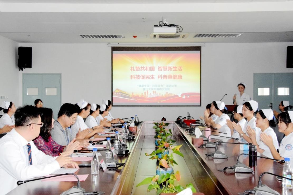 金秋九月,丹桂飘香,在喜迎中华人民共和国成立70周年之际,作为中华护理学会科普基地,厦大翔安医院积极响应中华护理学会“礼赞共和国,智慧新生活—科技促民生,科普惠健康”号召,围绕全院护理工作的35个科普主题举办了演讲比赛。初赛和决赛分别于9月25日和9月27日在综合楼三楼会议室举办,医技护药、党政人员以及住院患者及家属代表100余人参加了活动。