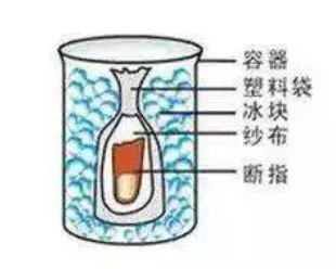 冰桶法:将断指装入干燥、密封的塑料袋中,再将此袋放入冰桶内,在袋周围填装冰块,盖好桶盖,随患者一同送入医院。