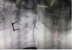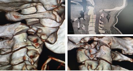 据悉,当时受伤患者颈部软组织严重肿胀,颈前两侧可见开放性创口。除合并多处肋骨骨折,甲状软骨骨折、气道损伤等多处损伤外,最为严重的是合并创伤性枢椎滑脱(traumatic spondylolisthesis of the axis,TSA)。患者入院后麻醉科、骨科、ICU分别予以经鼻气管插管、颅骨牵引、生命支持等对症处置。经颅骨牵引后患者枢椎滑脱已完全复位,局部软组织损伤渐进愈合,伤后3周颈前窦道彻底愈合、软组织肿胀消退,为下一步开展颈2.3之间的稳定重建奠定了良好的基础,手术时机成熟。
