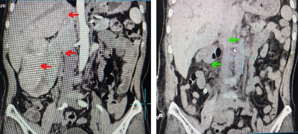 (术前:红箭头指示肾肿瘤和瘤栓 术后:绿箭头指示右肾和瘤栓被完整切除)