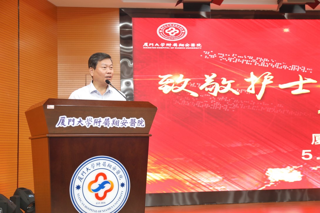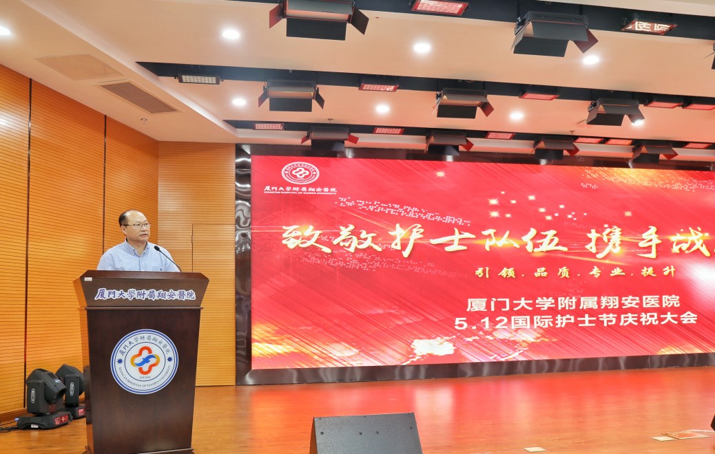 为热烈庆祝第 109 个国际护士节,弘扬南丁格尔精神,充分展示医院护理队伍良好的精神面貌和职业风范,厦大翔安医院于5月12日隆重举行“致敬护士队伍,携手战胜疫情”为主题的庆祝大会。吴立武书记、张国君执行院长、傅万里副书记、邵晨副院长、程继东副院长、机关各部门负责人及科室主任和医生代表出席大会,全体护理人员齐聚一堂,共同回顾过去一年来医院护理工作取得的成绩,表彰为医院护理事业发展特别是在抗击新冠疫情中做出突出贡献的团队及个人,会议由邵晨副院长主持。