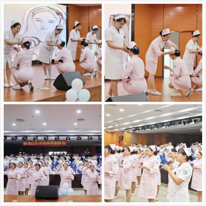 在悠扬乐曲、熠熠烛光中,神圣而庄严的授帽仪式及宣誓开始,护理部负责人都继微和厦门大学护理系叶本兰主任带领护士长等为2019年入职的护理人员戴上了圣洁的燕帽,重温南丁格尔誓言。