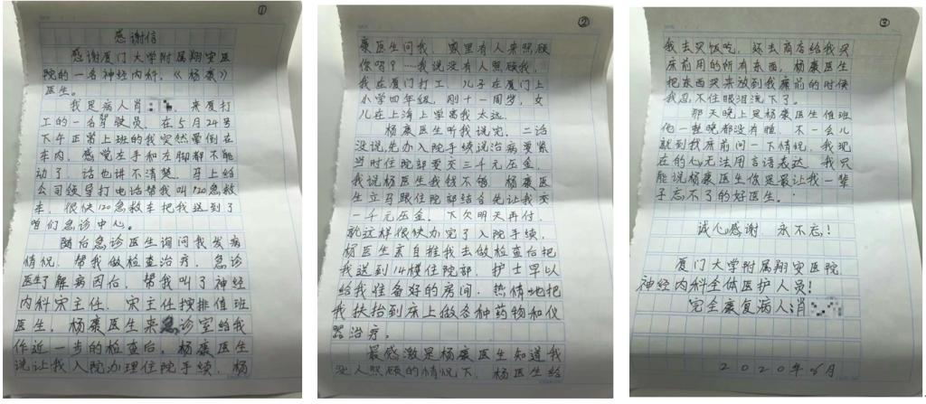 “患者给杨康医生写感谢信,一是对我们科室的治疗效果满意,还有就是感受到杨康医生和科室对他的重视和关心。”宋亚彬副主任医师表示,“患者及其家属一再表示,在翔安医院住院感受到了家人般的爱护和温暖。”
