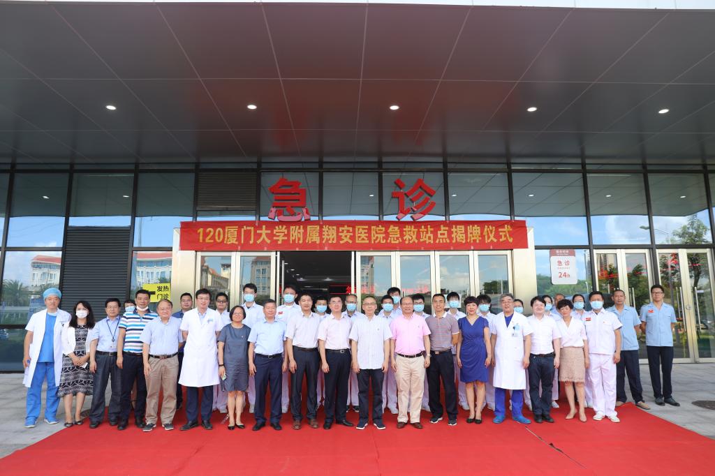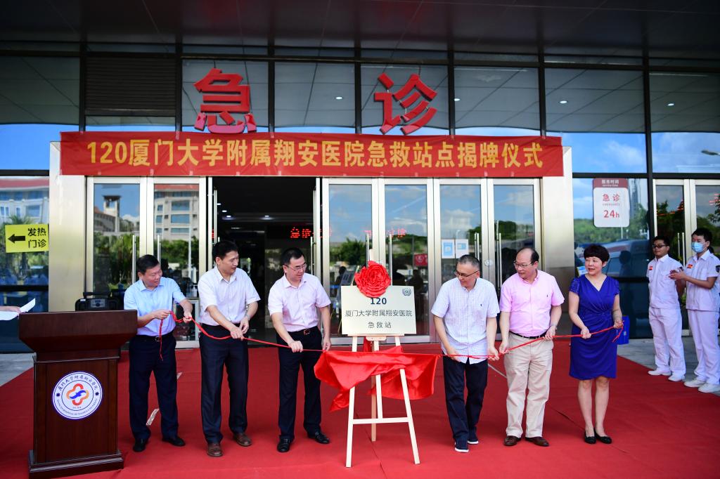 市卫健委应急办陈粮主任、陈邦清副主任、市急救中心吴启锋主任、董蓓蕴副主任、厦大翔安医院党委书记吴立武、执行院长张国君共同为120厦门大学附属翔安医院急救站揭牌。