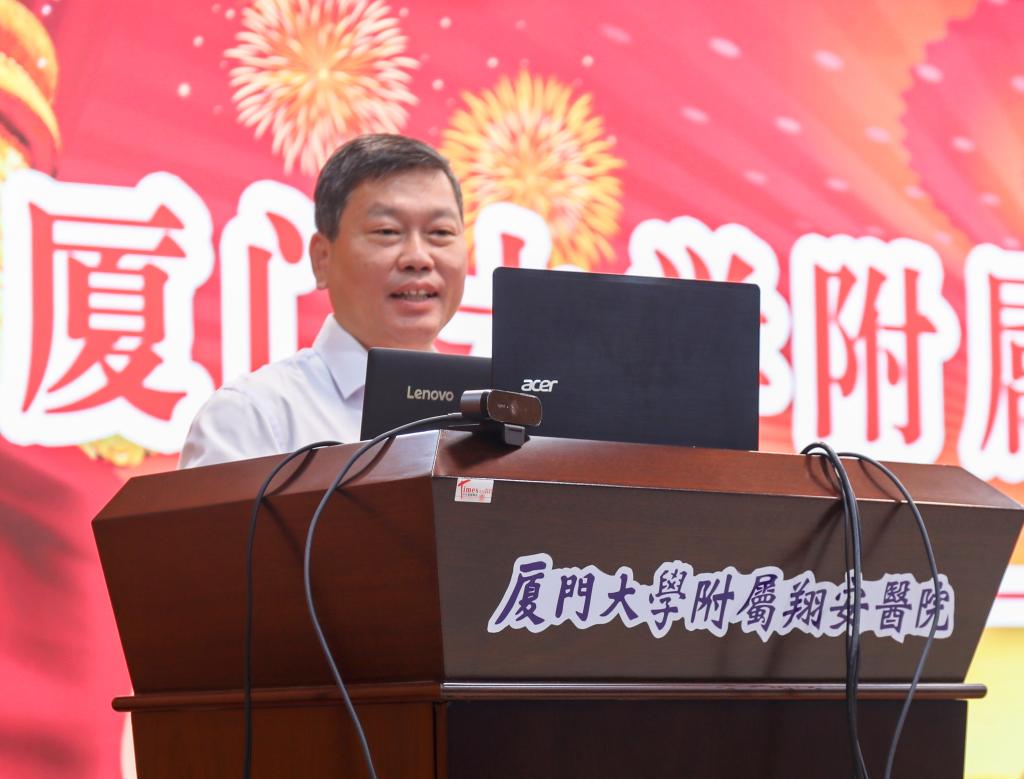 邓朝晖副校长代表校党委对附属翔安医院工会成立表示热烈的祝贺,就发挥工会组织作用、提高职工队伍凝聚力战斗力提出三点要求:一是医院党委要加强领导,坚持政治引领,开展群众性精神文明创建活动和以医德医风为重点的道德建设。二是工会要强化自身建设,做好桥梁纽带,切实解决职工最关心、最直接、最现实的利益问题。三是广大干部和医护工作者要发挥主人翁精神,争创一流,为医院建设、学校发展、服务百姓奋勇争先。