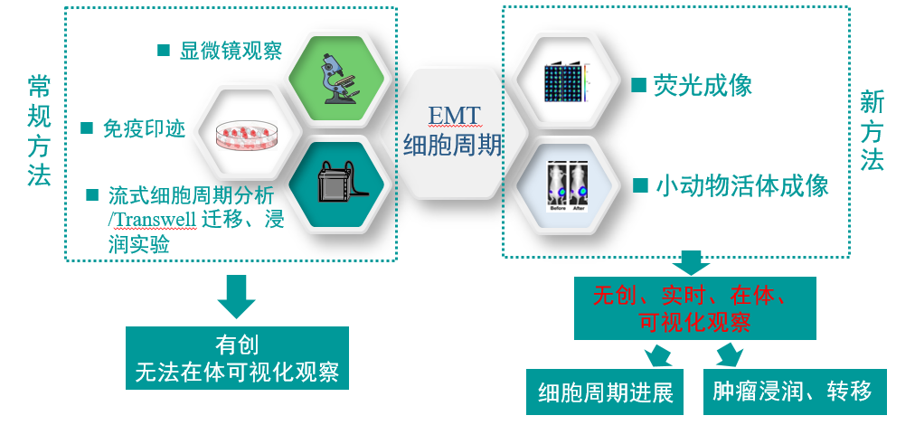 其次,建立了实时、可视化监测细胞周期和EMT进程的特异性分子影像报告系统,用于指导细胞周期靶向药物和抑制肿瘤浸润转移药物的疗效评估。