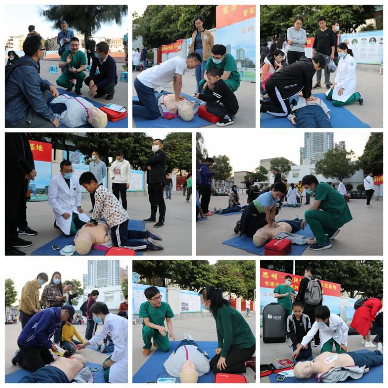 本次活动内容丰富,形式多样,涵盖知识讲解、技能练习、健康咨询以及义诊。首先由心血管内科的黄志航医生和呼吸内科的胡群医生为广大市民进行心血管、呼吸系统疾病知识科普,他们用生动的疾病案例介绍了如何更好地预防秋冬季常见病;为了让市民朋友了解面对危及生命的突发情况如何应对,胸外科姚建宇医生和急诊医学科张睿医生通过讲解和操作示范,详细地讲授了院前急救流程,强调尽快拨打急救电话120、拿取AED(自动体外除颤器),尽早开始有效的胸外按压;随后,麻醉科邓斌医生讲解并示范如何开放和清理呼吸道,进行急救呼吸;最后,国家临床教学培训示范中心付歆欣老师介绍并演示了如何使用AED,并强调尽早使用AED的重要意义。
