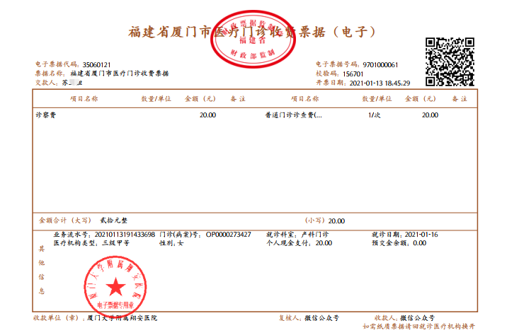 2021年1月13日18:45分,厦门大学附属翔安医院成功上线医疗收费电子票据系统,并开出首张医疗收费电子票据(票据号码:9701000061)。医疗收费电子票据的正式启用,标志着厦大翔安医院跨入医疗收费票据“无纸化”时代。