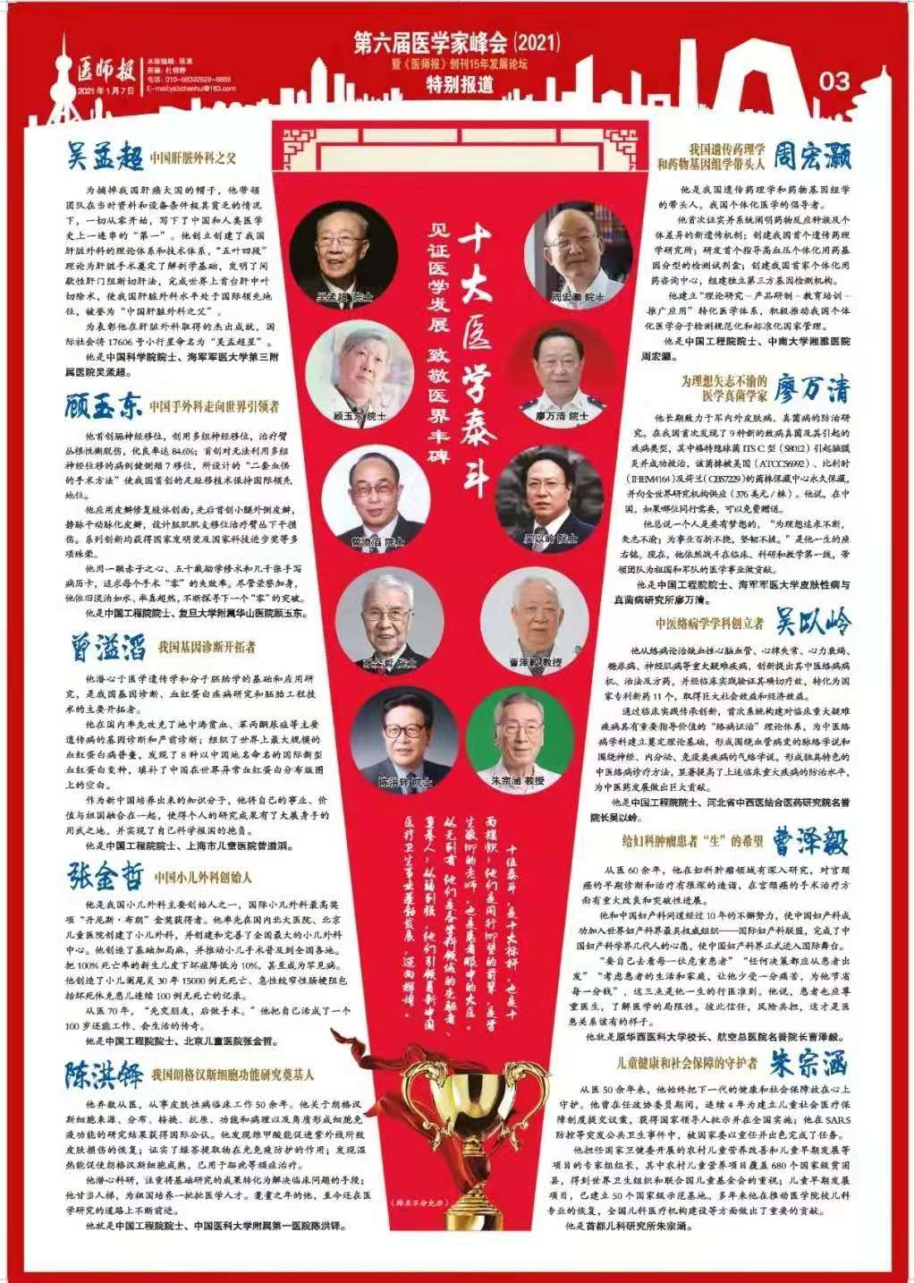 1月10日,由《医师报》社主办的“第六届医学家峰会”在京召开。自2020年起,《医师报》发起“致敬医界丰碑”系列荣誉,致敬并纪念“医界丰碑”式的医学专家,厦门大学附属翔安医院院长陈洪铎院士当选“十大医学泰斗”。
