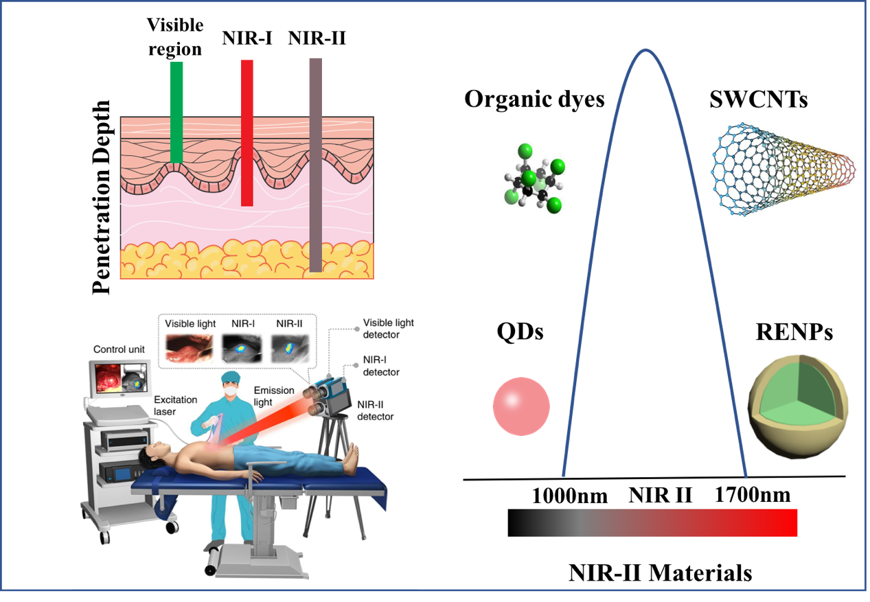 作为一种新兴的非侵入性成像方式,近红外(NIR)荧光成像具有高时空分辨、高灵敏及无电离辐射等特性,在引导肿瘤手术中具有独特的优势。近年研究发现,相较于临床应用较为广泛的传统近红外一区(NIR-I, 750-900 nm)成像,近红外二区(NIR- II, 1000-1700 nm)荧光成像具有更低的组织光散射、吸收以及自发荧光,可显著提高成像深度和分辨率,进一步提升术中的成像质量,有望实现更为精准的术中导航。目前国内外学者已开发出一系列NIR-II荧光材料,包括有机小分子染料、有机半导体聚合物纳米粒子、量子点(QDs)、单壁碳纳米管(SWCNTs)和稀土掺杂的纳米粒子(RENPs)等,并基于这些新型材料应用于肿瘤精准定位、手术切缘评估、淋巴结示踪和重要解剖结构显影等方面展开了大量的临床前研究,并初步迈出临床转化的脚步,结果展现出广阔的应用前景。