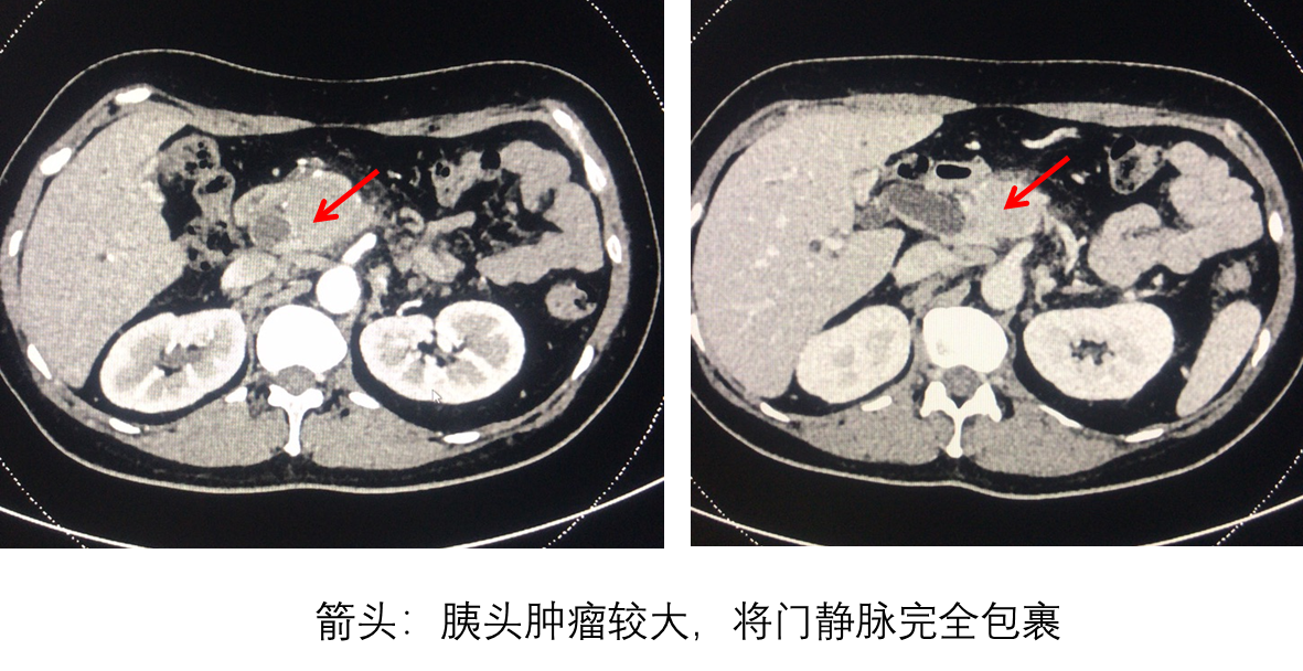 术中探查:胰头肿瘤非常大,侵犯了门静脉;下腔静脉、左肾静脉受压变窄,下腔静脉和腹主动脉之间多发肿大淋巴结,门静脉完全被肿瘤包裹。