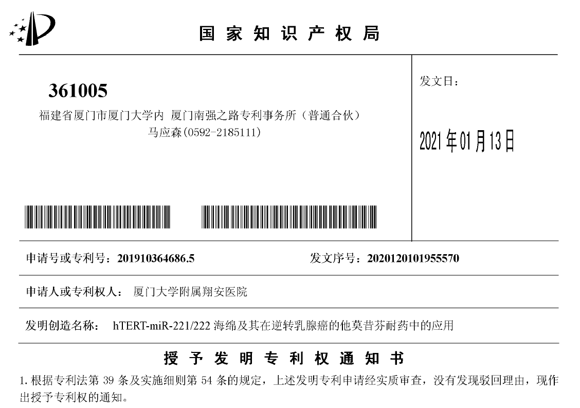 近日,以张国君、陈敏、欧阳檐秀、冯军为发明人的发明专利“hTERT-miR-221/222 海绵及其在逆转乳腺癌的他莫昔芬耐药中的应用(201910364686.5)”获国家知识产权局授权。