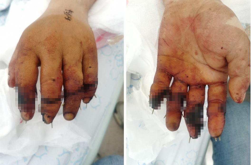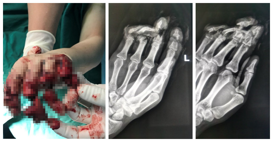 不久前,赵先生工作时被电锯不慎锯伤,随后被紧急送往厦大翔安医院。骨科医生检查创口见:左手第2-5指离断,创缘软组织捻挫严重,示指仅腹侧少量皮肤相连,中指、小指仅一细细皮条相连,环指仅残存部分屈肌腱相连,指端色白、皮温低,压之萎陷、无弹性。X线示:左手2-5指中节指骨粉碎性骨折,骨折断端不规则,可见多个游离骨碎片。