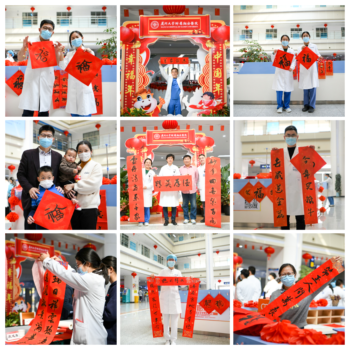 书法家刘茂青、庞成勇、厦大书画协会书法爱好者吴世辉、林重阳、我院内分泌科王威主任挥毫泼墨,一幅幅寓意新春吉祥、美好祝福的春联、福字,依次呈现在大家眼前。