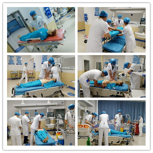 在完成生命支持的课程培训后,为了更好得结合临床实际和科室现有设施,急诊医学科组织了多次实战化演练。下图展现的是从120上转运下来的患者,接诊护士首先对其进行基础生命评估,在确认心脏停搏后,启动应急反应流程,并立即开始胸外心脏按压(通过与模拟人连接的监测仪,在演习后对按压的质量进行评估),在应急小组到达现场后,开通高级气道,建立静脉通道,从基础生命支持过渡到高级生命支持,整个复苏过程持续20分钟,做到流程顺畅、快速有效,分工明确;演练促进医护人员的急救团队意识,提高了团队抢救能力。