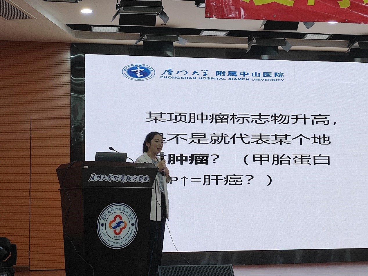 厦门大学附属中山医院熊欢护师与台下观众亲密互动,讲述了肿瘤标志物升高与肿瘤的关系。
