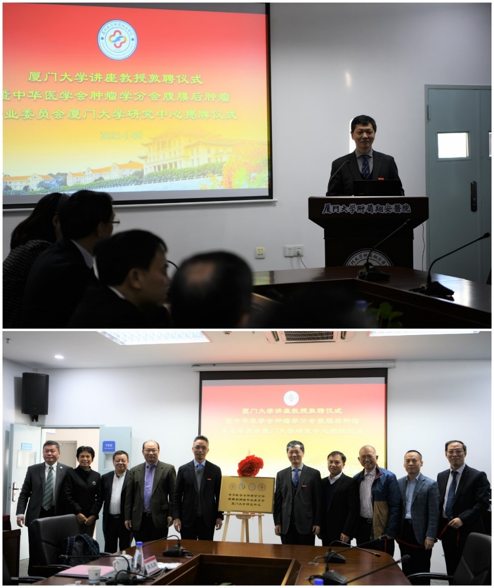 近日,我院举行了厦门大学讲座教授敦聘仪式暨中华医学会肿瘤学分会腹膜后肿瘤专业委员会厦门大学研究中心揭牌仪式,受聘教授罗成华教授,厦门大学副校长周大旺,厦大医管办主任、医学院书记张建安,厦大科技处副处长吴喜平,附属翔安医院党委书记吴立武,执行院长张国君,肝胆外科主任李文岗参加揭牌仪式。