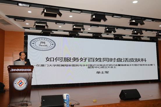 厦大翔安医院皮肤科主任单士军副教授作了题《如何服务好百姓,同时盘活皮肤科》的主题演讲,阐述了如何从皮肤科医疗工作的角度服务于乡村医生的一些措施与思考,希望通过技术交流带动乡村医疗卫生人员皮肤科诊治能力的提升。